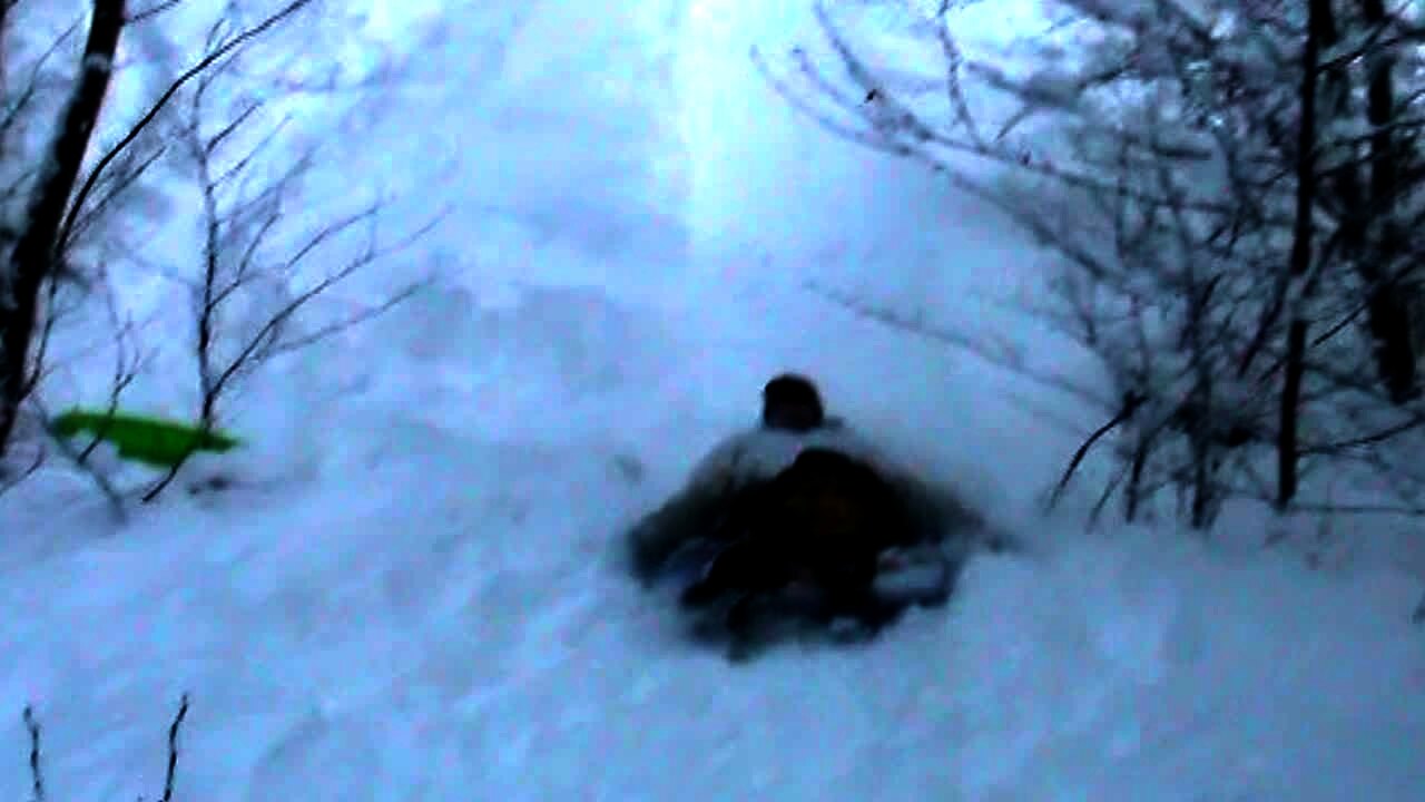 Young boy & woman ride on an inner tube down snow hill. Black dog runs towards them & they run the dog over. Winter.