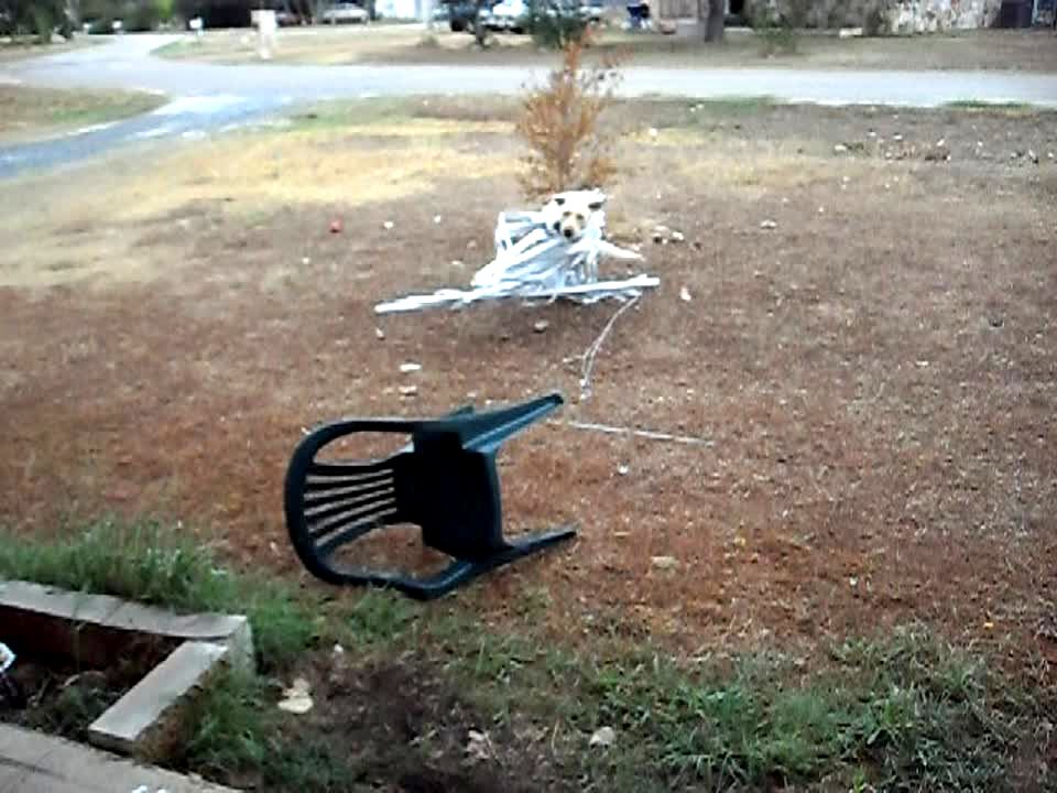 "Barking Through the Blinds" Dog runs around outside while completely stuck in window blinds. Owner came home to find dog had ripped blinds off window and dog stuck inside blinds.