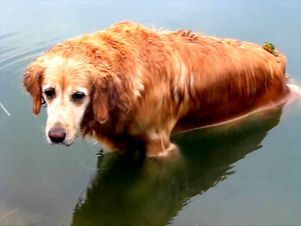 Golden retriever dog in lake bed stares at frog on shore as other frog sits on dog's back/butt.
