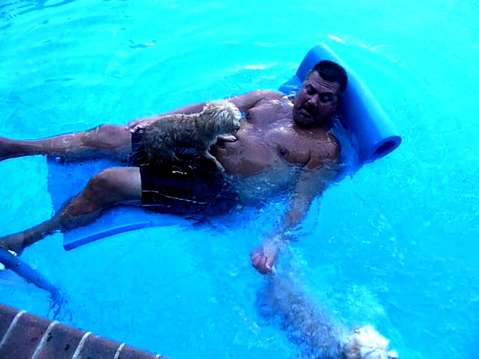 Brown boxer dog licks at water through a hole in the patio table as man sprays the underside of the table with a water hose.