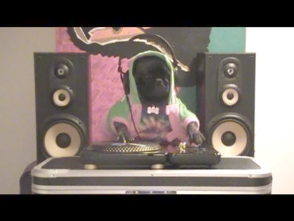 Bulldog on the couch barks at a stuffed toy monkey on a table. Dog knocks the monkey off the table, reaches for it falls off the couch. Dog lands on the floor hard.