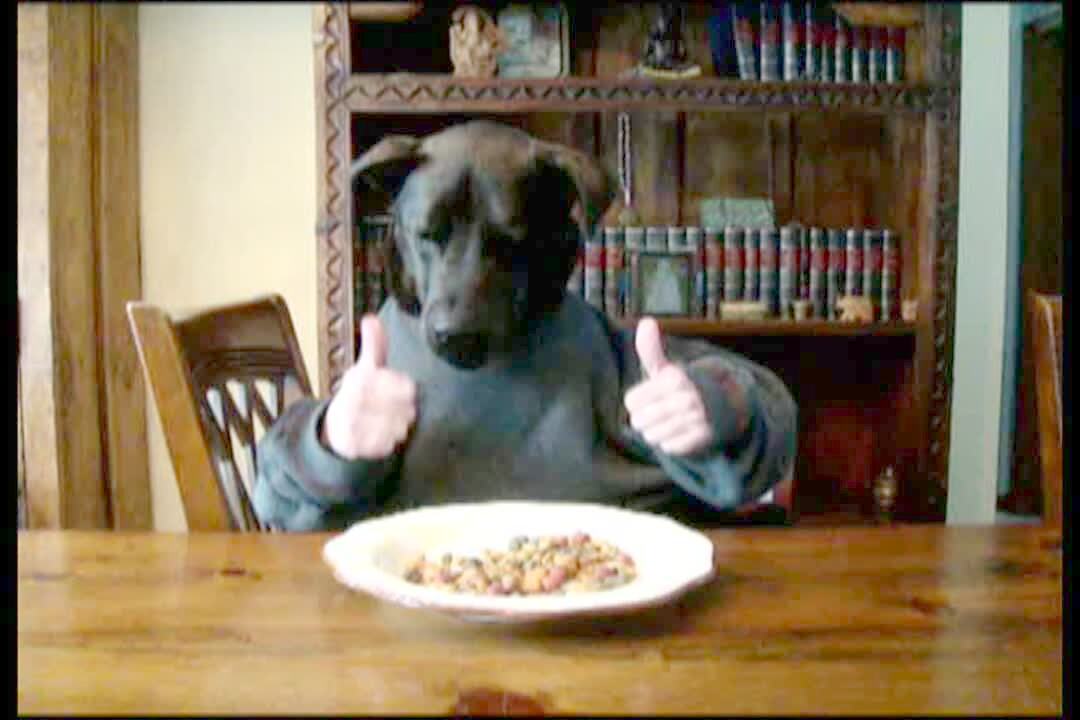 Puppy dog's legs go up in the air when he eats.