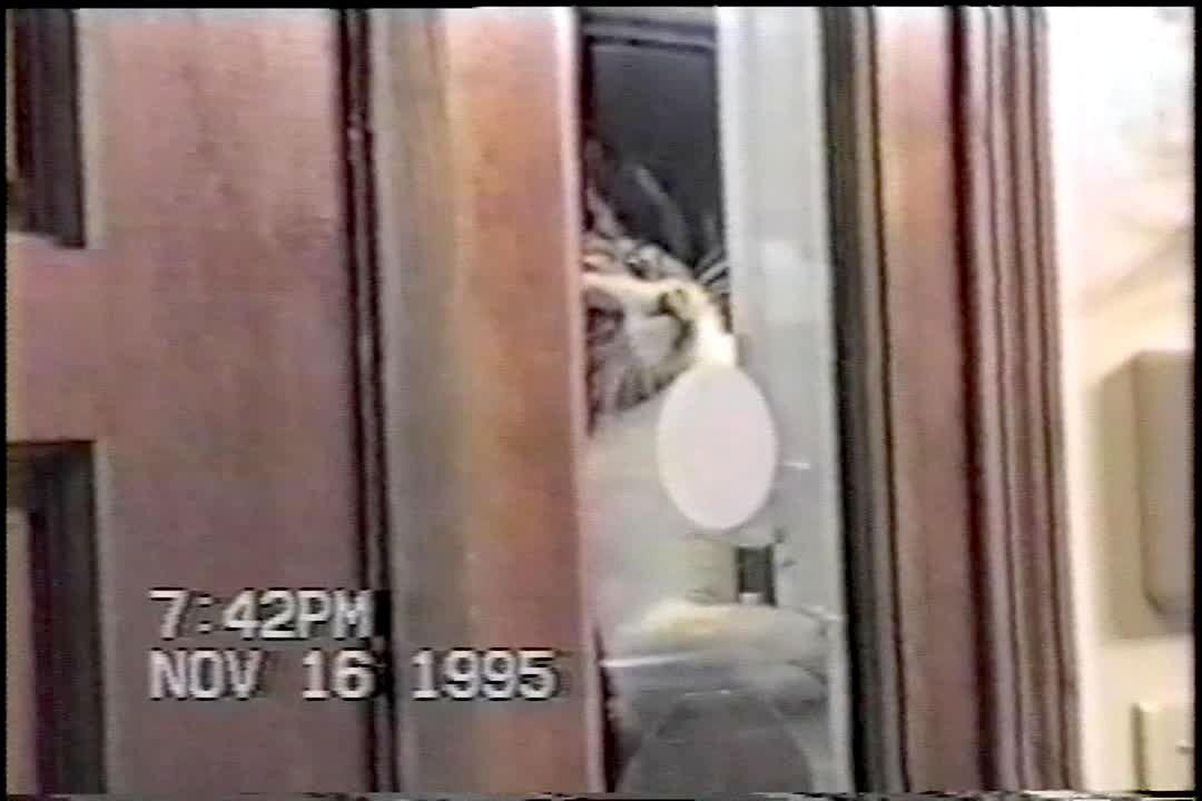 A man carries a cabinet outside and across a front lawn. The cabinet falls apart in his hands. Security Footage.