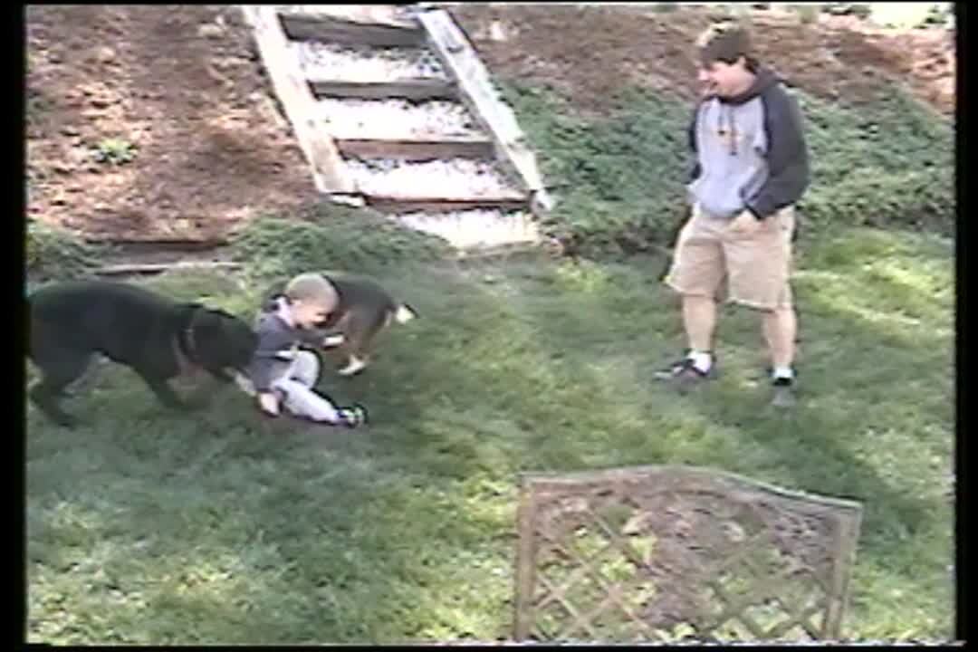 A dog runs out of a front door, then it runs in between a young girl's legs and drags her across a yard. Security camera footage.