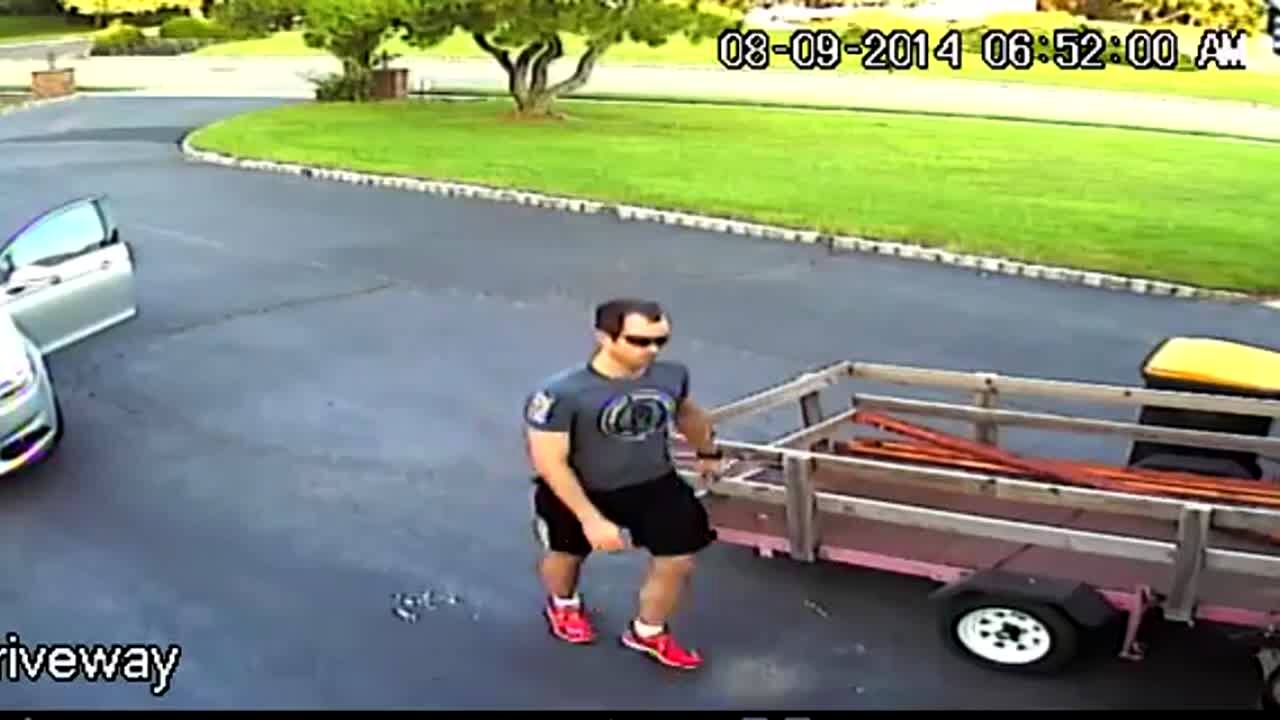 A man pulls his car up to his house, steps out to walk into his house, and doesn't realize his car rolling backwards down the driveway until he runs back out of his house, catches up to the car, and stops it as it goes into the street. Security camera footage. No sound.