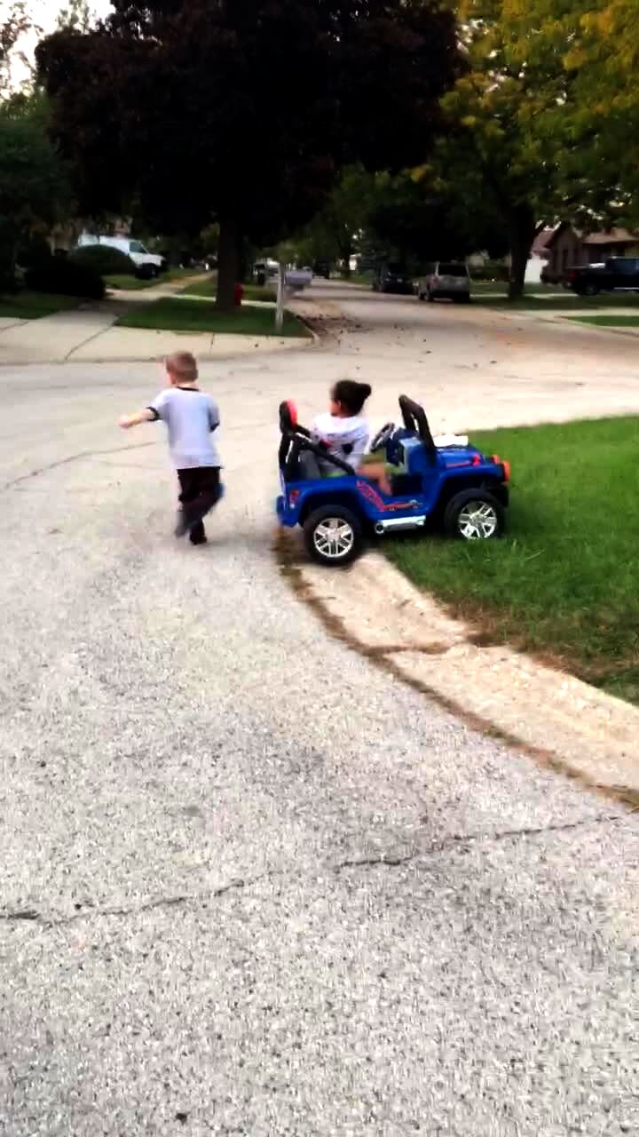A boy instructs his tot sister on how to drive a power wheels car while he rides behind her in a trailer wagon, then hops into the car to push the gas for her when she can't figure it out. He steps back into the wagon when she hits the gas and he falls out and gets run over.