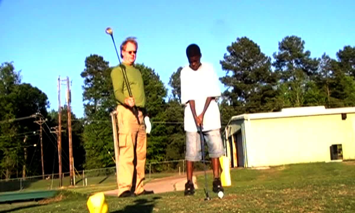 teen boy has a golf lesson. Practices swinging his club slowly and hits instructor / teacher in the head.