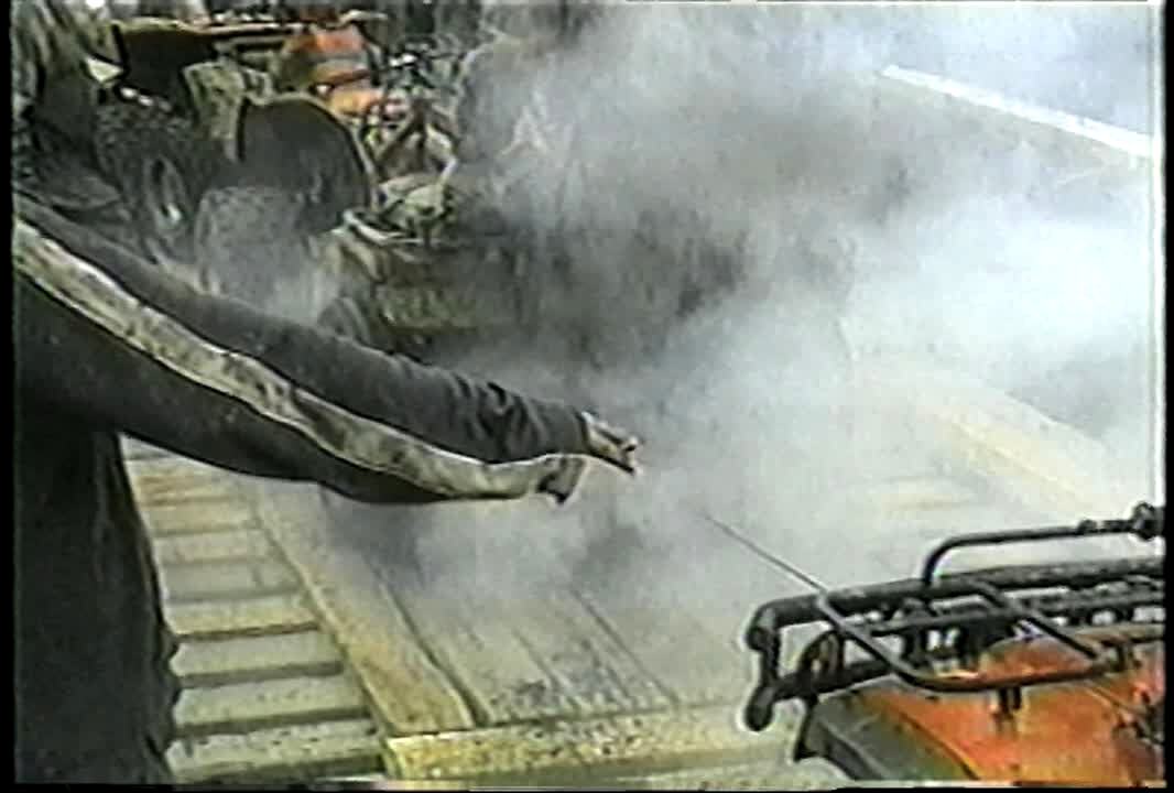 Man burns rubber/ tire on trailer and creates a lot of smoke. Burn out