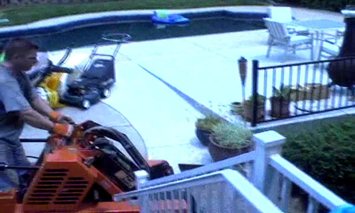 Man riding a go cart (lawnmower) with big wheels in rear, falls off cart, then the big wheels come off the cart. mower lawn grass cut
