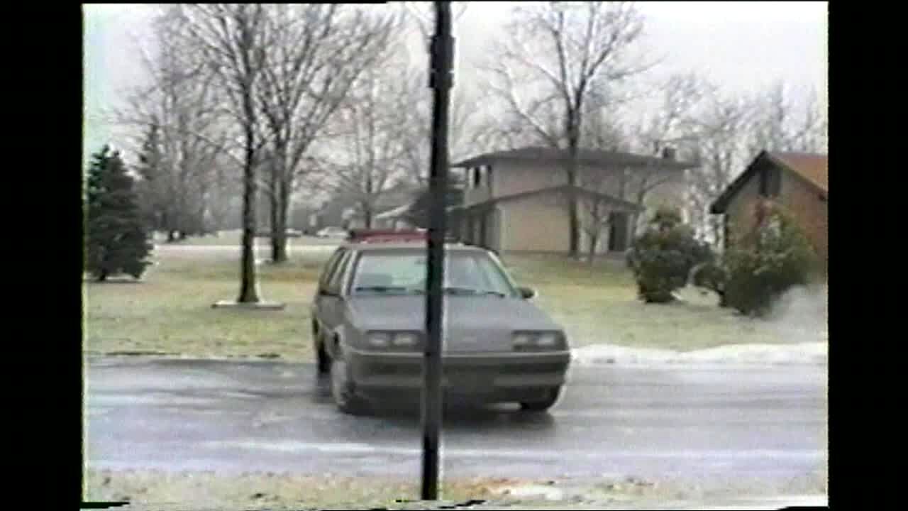 Driving test: Car backs out of garage, does about face when it spins on ice, but ends up facing the proper direction