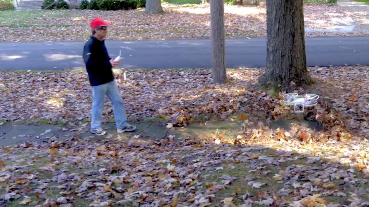 A man pilots a remote controlled drone outdoors, using it the blow leaves off of a sidewalk. And now a moment with.