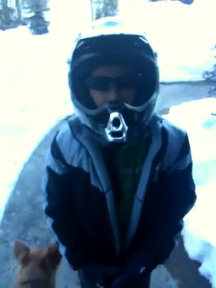 Young boy tries to remove large icicle from the side of the house and it falls on him.