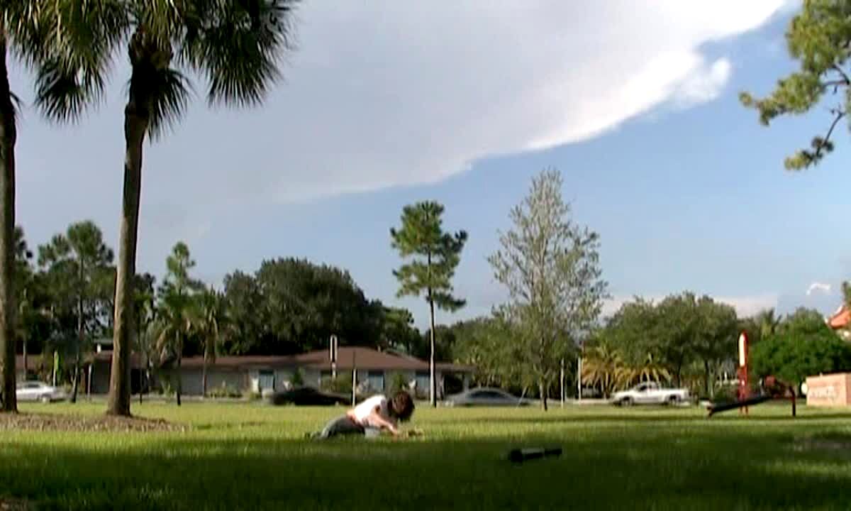 A senior man walks out front to adjust his flag and his pants drop, but he does not acknowledge them. Security footage.