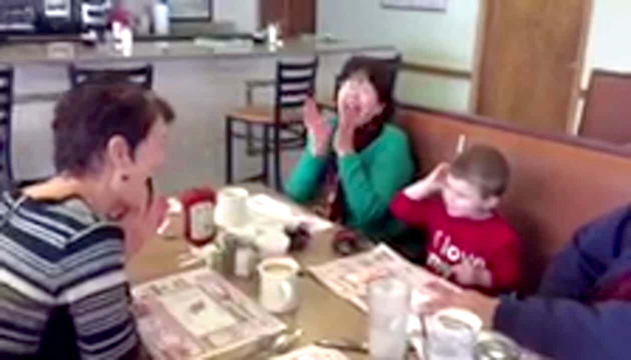 A teen girl shoots a straw wrapper at a boy across a restaurant table when the wrapper sticks in his ear in slow motion and their family laughs.
