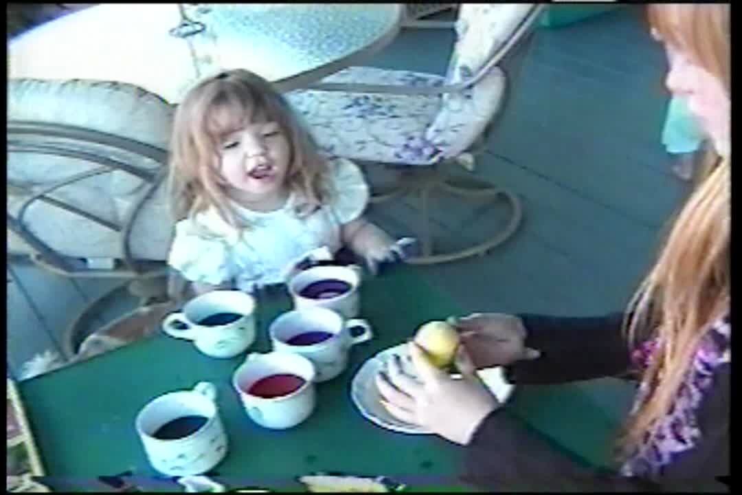 Tot girl coloring Easter Eggs knocks over the entire table.