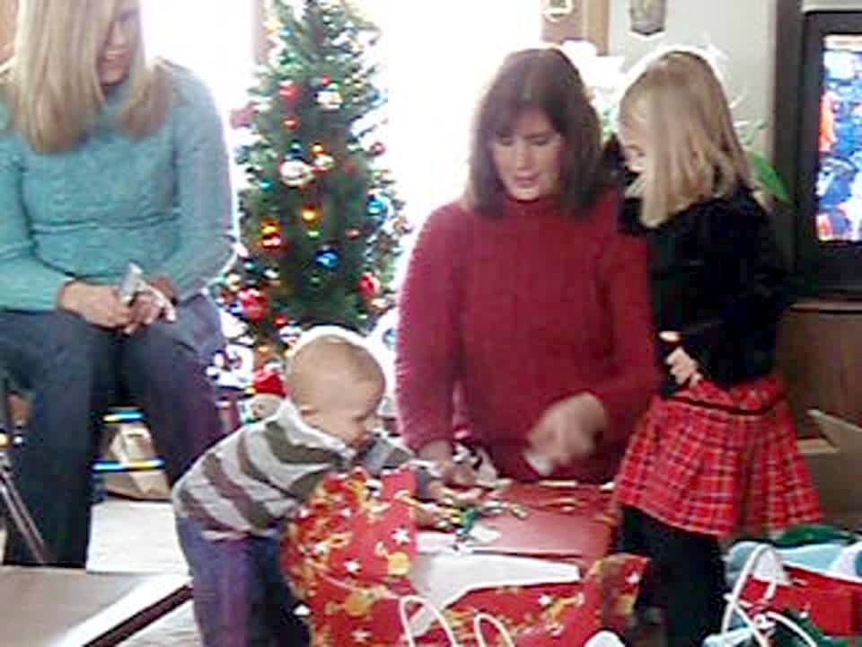 Tot boy and girl open a large gift box at Christmas. They get an Elmo doll, then the boy falls into the box.
