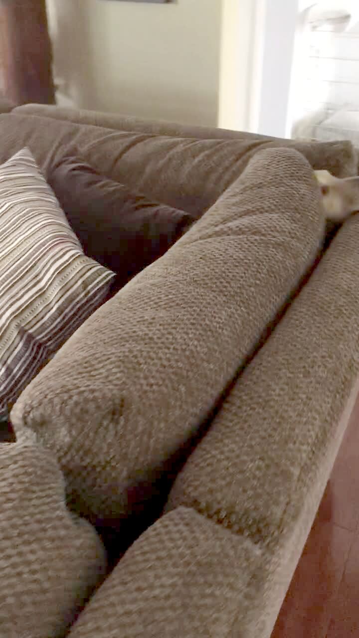 A dog hides behind a couch cushion in the living room because it's scared of a vacuum cleaner.