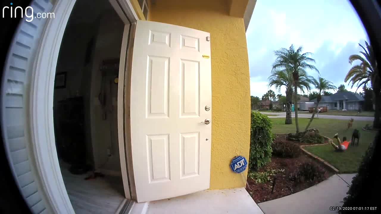 A woman falls face first down the front porch steps when she takes a puppy dog outside. Security footage.