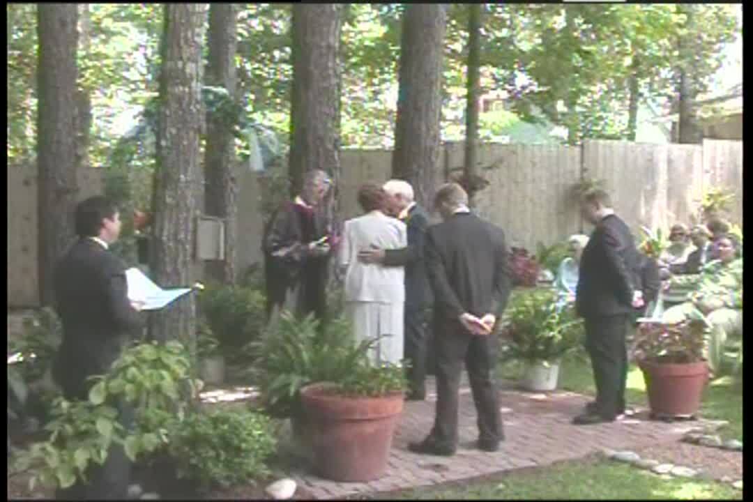 Man & woman get married outdoors, groom starts leaning a bit & almost faints. Man lays down before he falls over completely. Bride has good reaction. Wedding ceremony.
