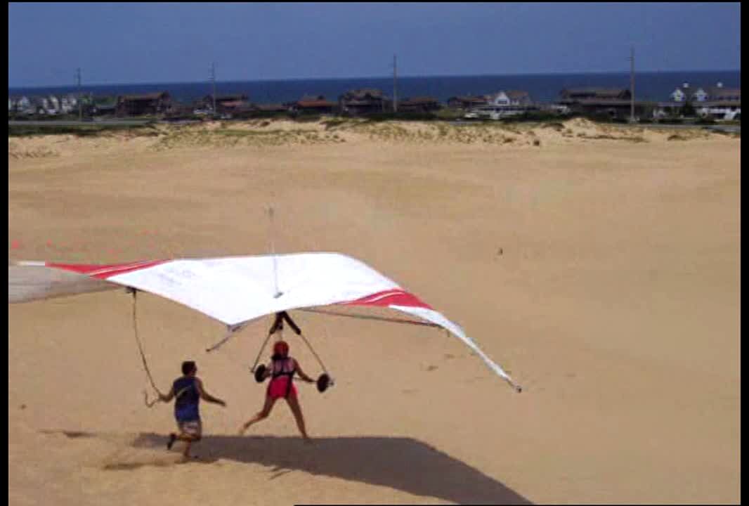 Man and woman hang glide on beach sand, woman flies and falls. Hang gliders. Short tails.