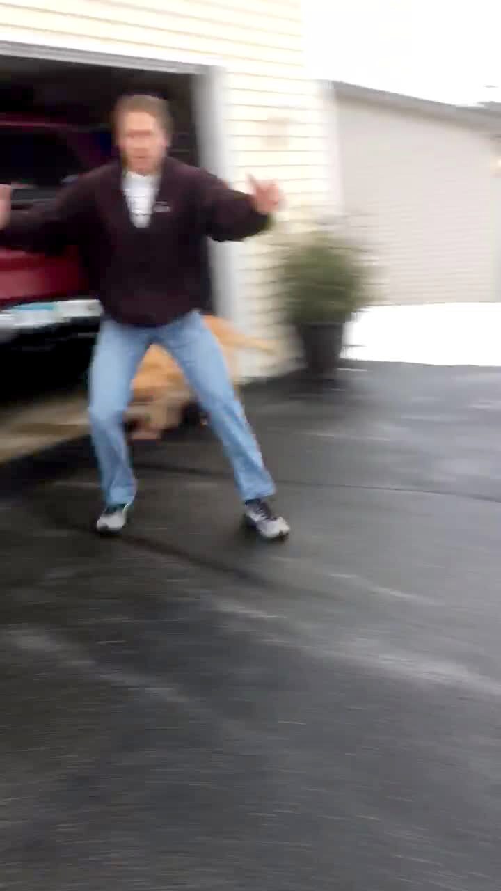 A man and two girls dance to a song in the living room. Then the man starts to pick up the girls and at 0:55, he gives a piggyback ride to one of the older girl and loses balance and falls.