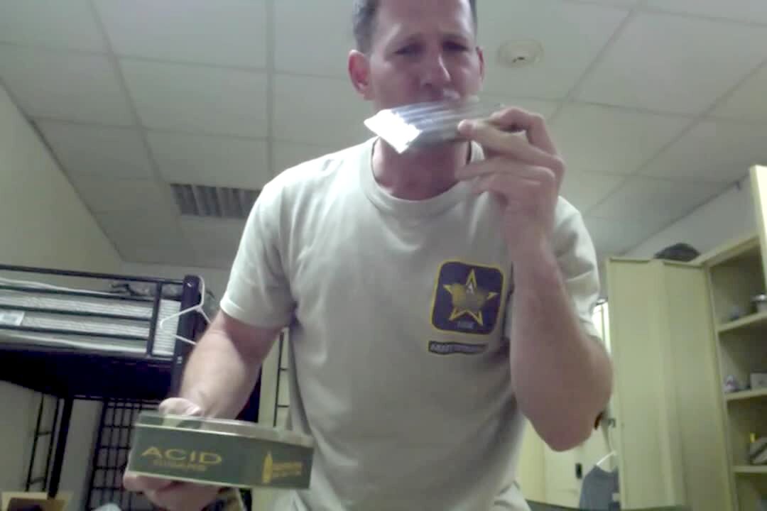 A man in an Army shirt excitedly reveals cigars that he has received in a care package while abroad. He starts to dance and falls over backwards.
