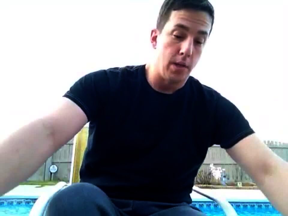 A man demonstrates how to use a resistance band next to a swimming pool. He stretches it on his foot, it snaps into his face, and he falls into the pool.