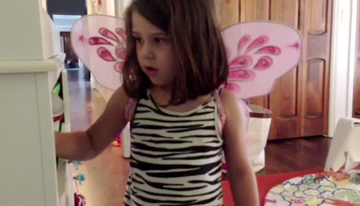 A girl wearing pink fairy wings bossily tells her father not to touch her toy microphone. She slips as she walks away and falls.
