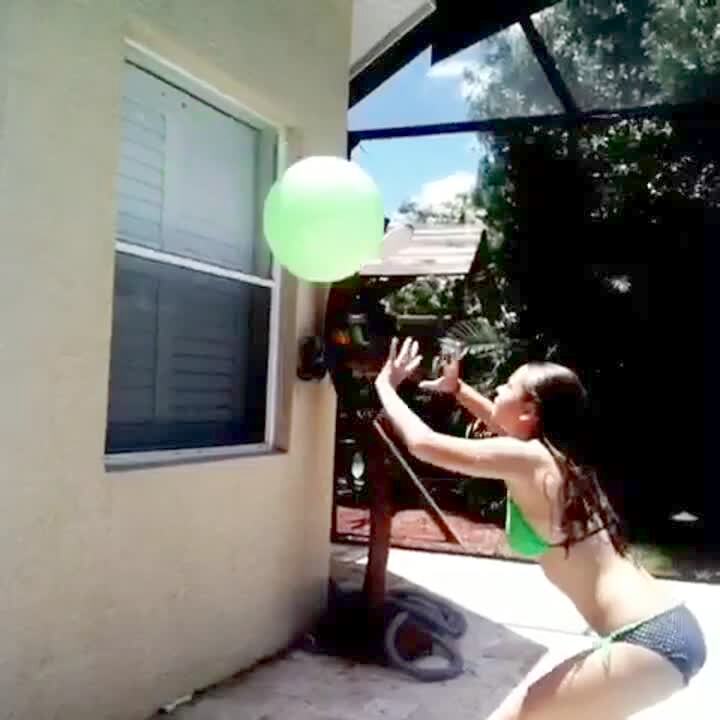 A teen girl spikes a work out ball into a wall, causing it to knock her backwards into a pool.