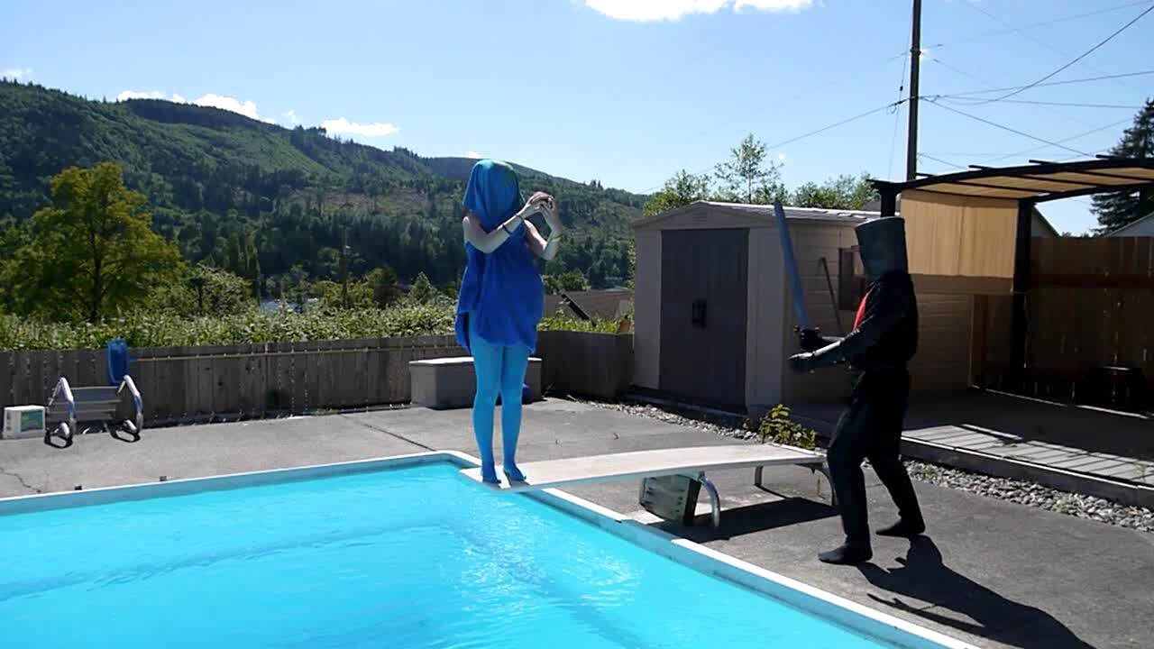While filming a scene a teen boy dressed as a black knight falls into a pool.