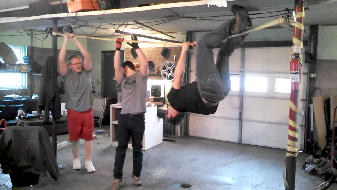 Three teen men hang from a strap in a garage. A support beam breaks and they all fall. Short tail.