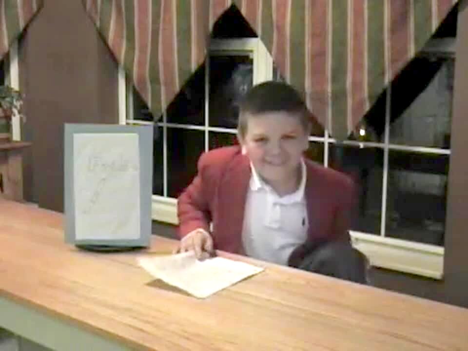 Boy does fake newscast, he laughs & then falls backwards off the bench he's sitting on. He cries. Cuts to him getting ready for another takes. Bloopers. Performance problems.