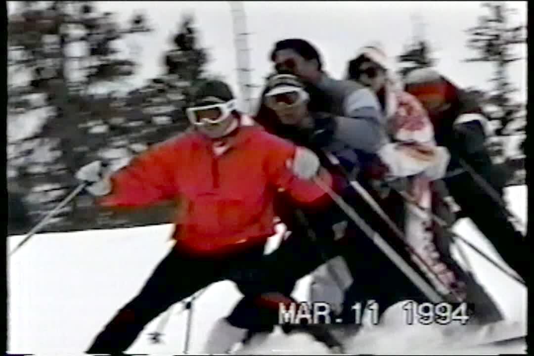 Line of snow skiers all fall. Date on screen 1994.