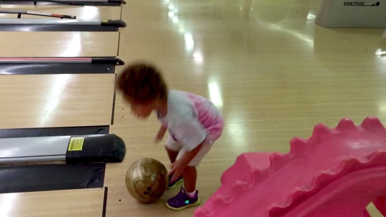 A senior man falls down when he rolls his bowling ball.
