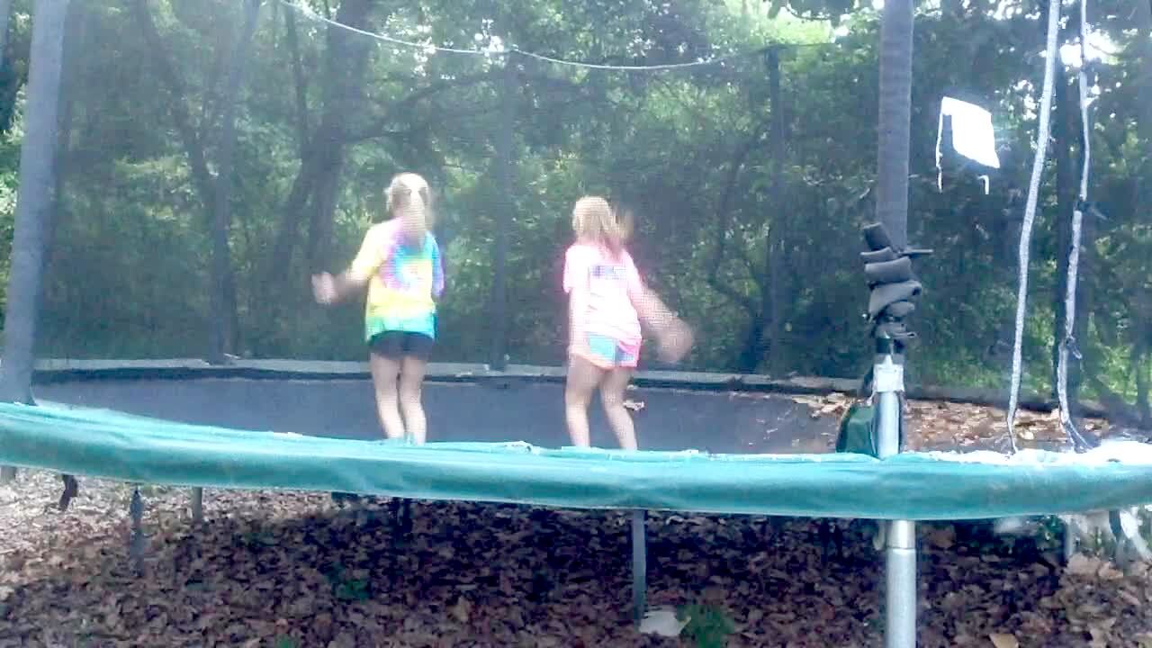 Two teen girls perform a dance routine and one of them falls into a globe in a bedroom.