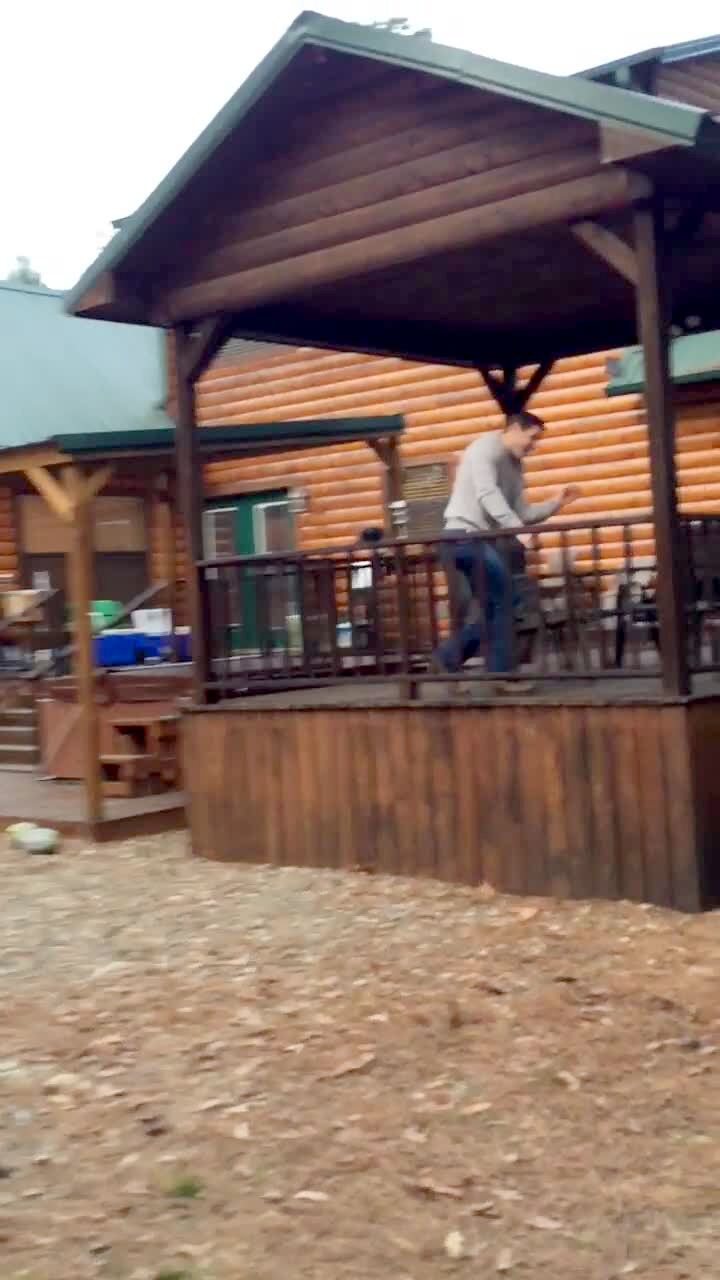 A boy lays on a hammock on a porch and a teen boy jumps on it and launches him in the air and the boy flies over the railing and off the porch.