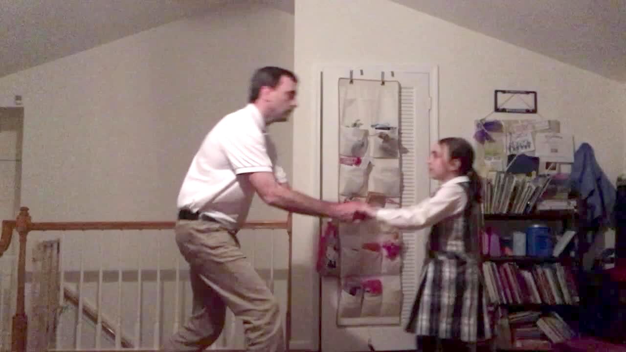 A man drops his daughter while they practice a dance indoors.