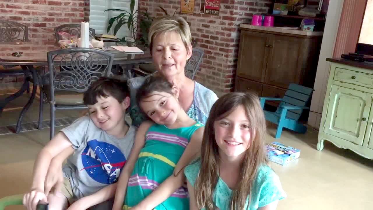 A man jumps on a trampoline with three young girls and a young boy and he breaks it and falls through onto the ground in a backyard.