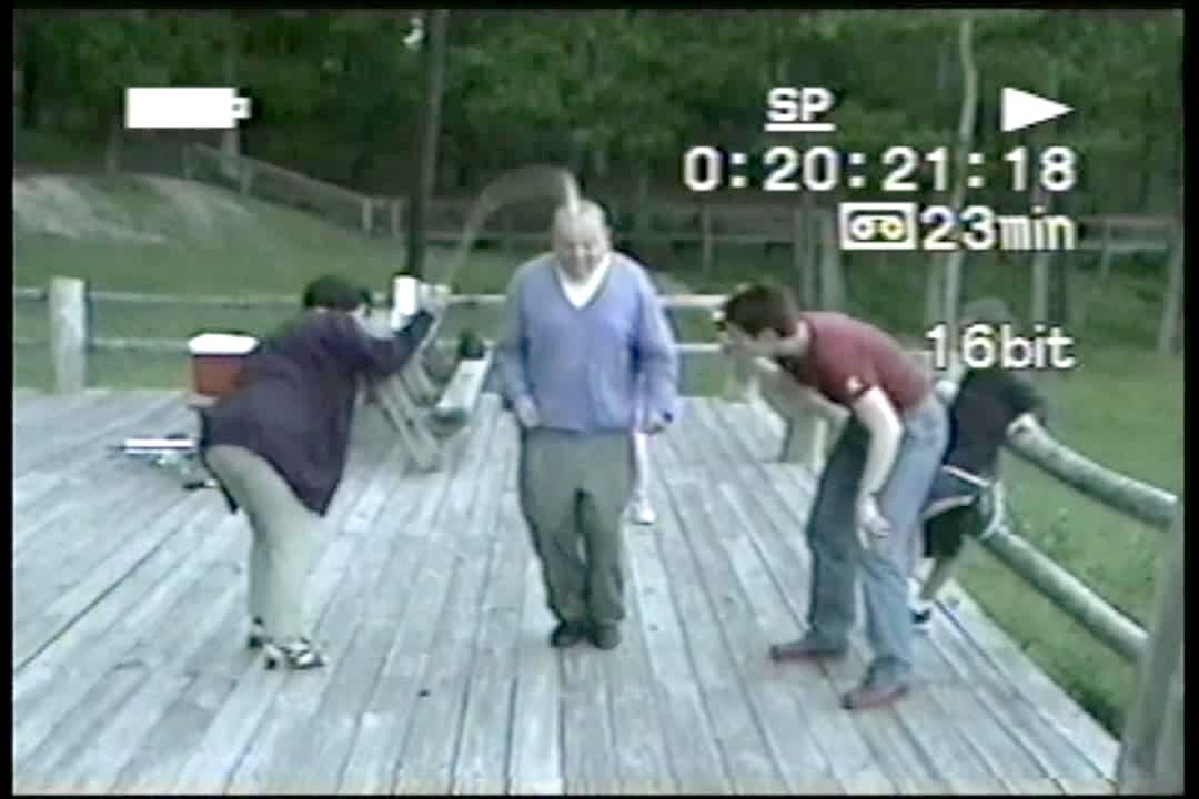 Man spinning around baseball bat falls trying to walk (he does this twice).