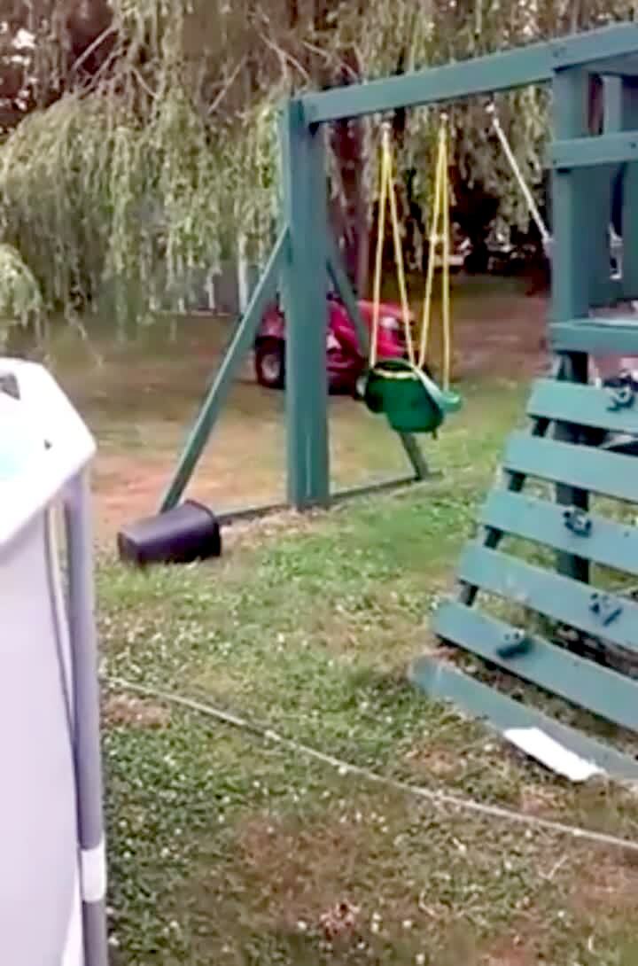 A woman tries to sit in a hammock but falls out of it repeatedly in the front yard. Security footage.