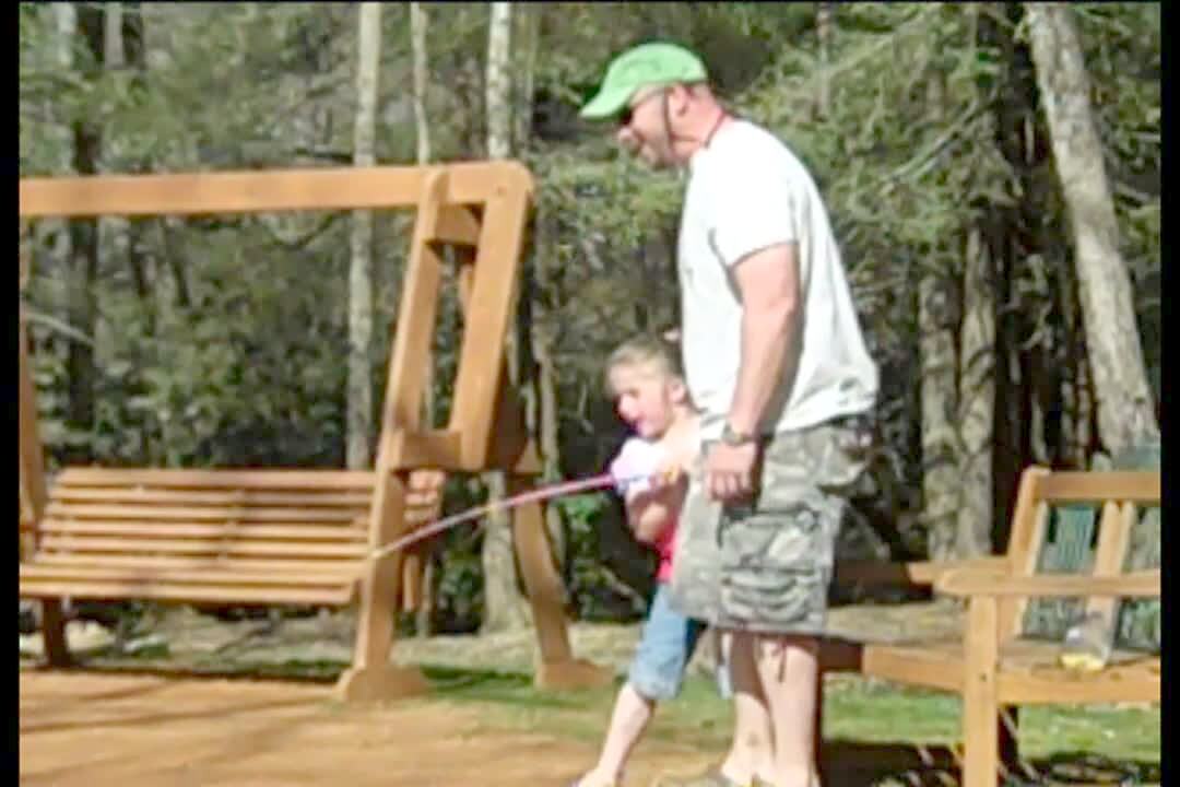 Young boy tries to cast fishing pole next to dad. Dad puts his hands up to protect himself & accidentally pushes boy into the water.