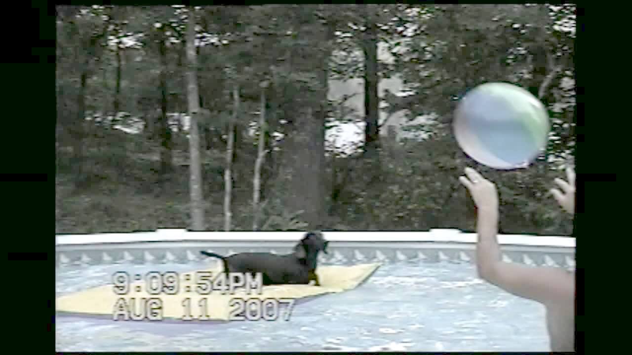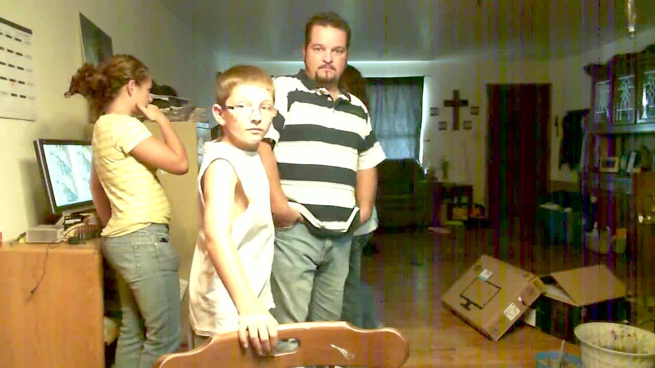 Man fills kiddie pool with water, puts it at the bottom of a slide and covers it with leaves. Boy runs down the slide and jumps in the pool, thinking it's just a leaf pile, he screams. Practical joke. Family describes the plan.