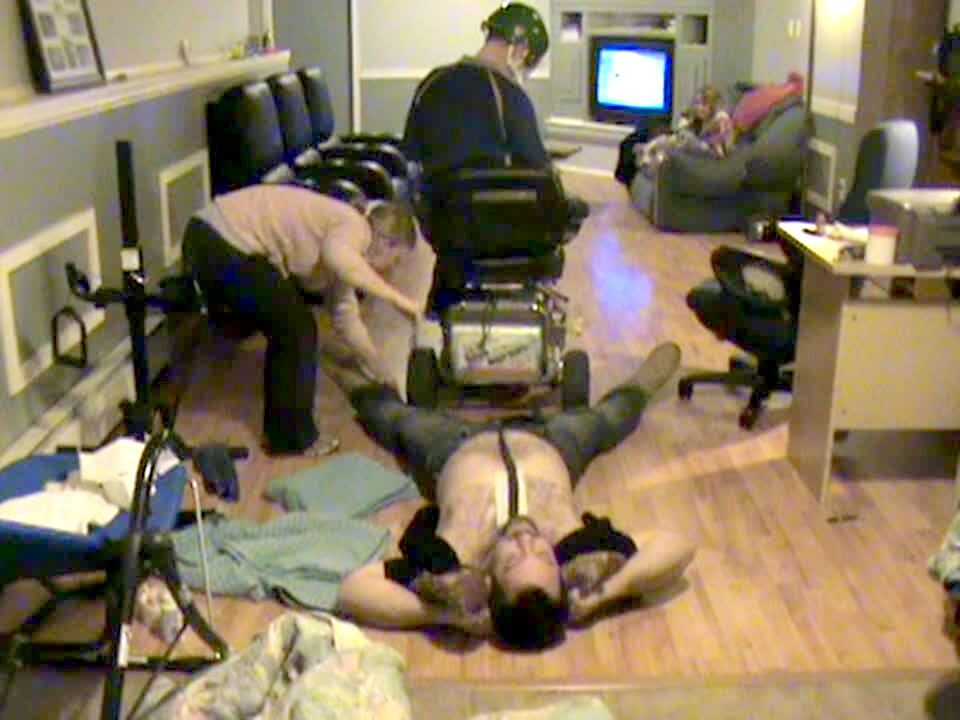 Man lays on the floor and lets teen boy & girl wax his chest hair by putting waxing strips at the end of a rope & pulling them off with an electric scooter / wheelchair.