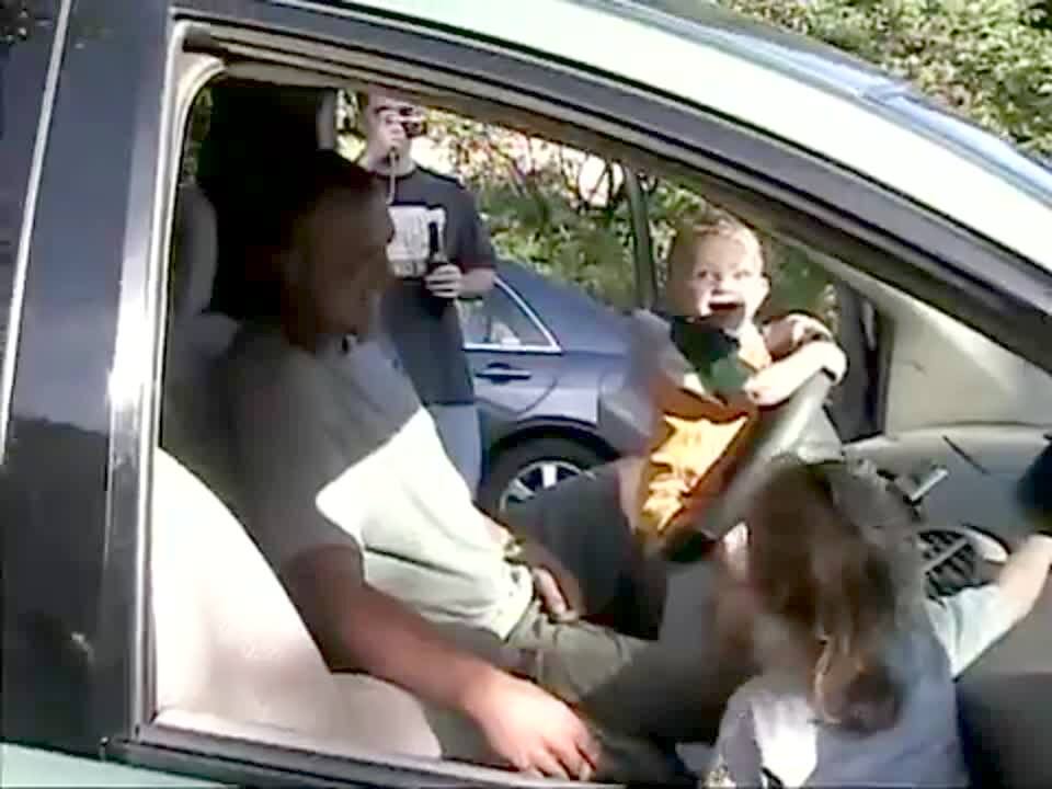 Baby boy sitting with his legs through the steering wheel repeatedly honks car horn with belly by jumping up & down.