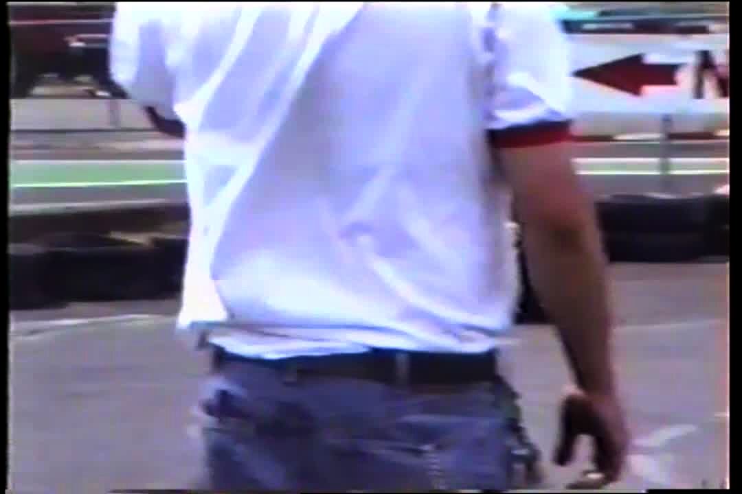 Young boy hits / crashes into the back of his dad's go kart with his own cart. Dad's head snaps back.