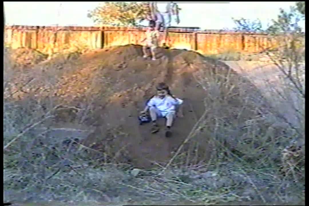 Mom on FENCE RAIL. Son joins her. FENCE BREAKS.