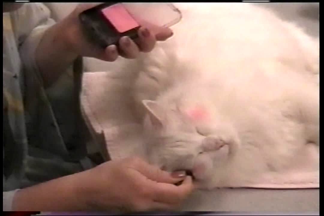 Woman puts pink blush / makeup on white cat with small brush. Cat just lays there upside down.