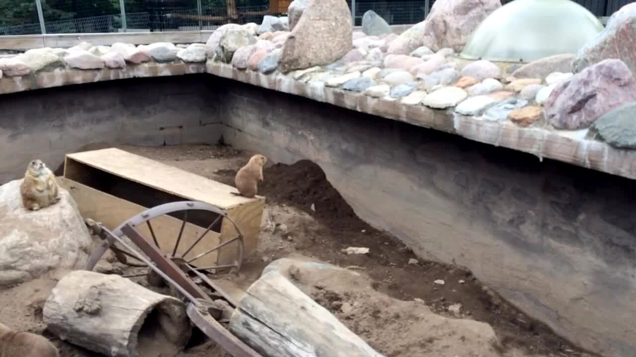 A gopher in an enclosure tries to jump from a stand to the side of the enclosure and misses, falling.