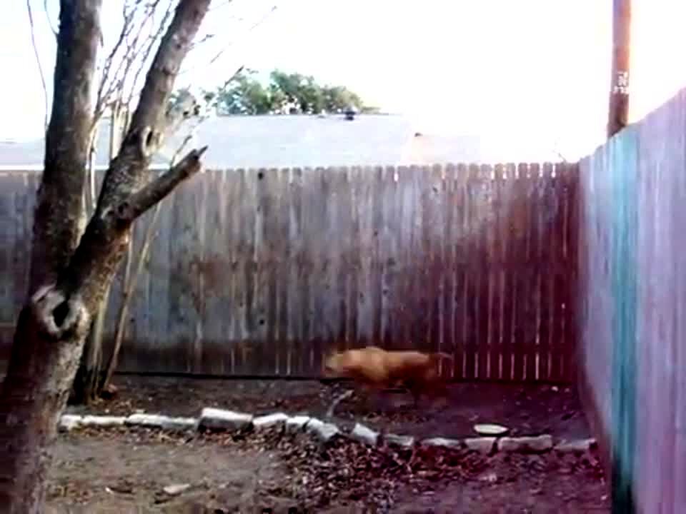 A small Chihuahua dog in pink sweater climbs up a metal fence in a backyard and escapes. Mission Impossible music is laid over video.