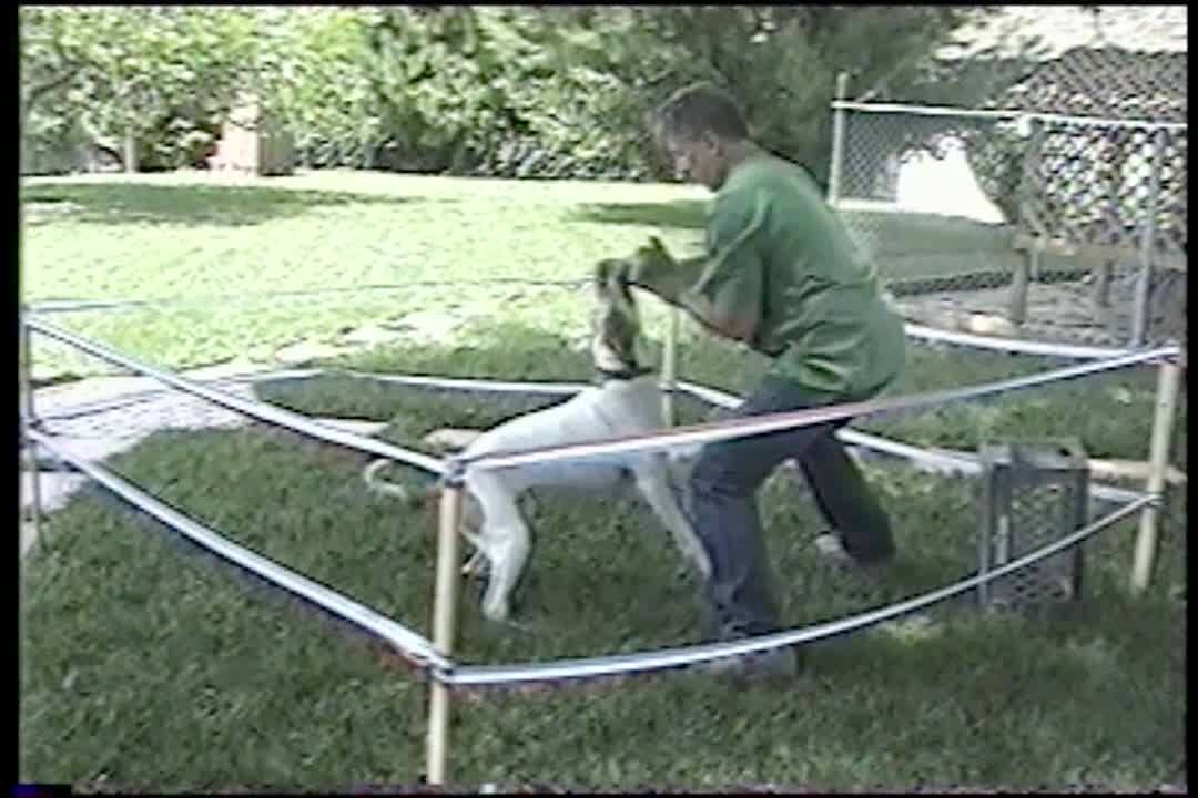 "Ring A Ding Ding" Dog boxes with man in small ring. Woman yells "Ding!" and they start fighting. They stop when she makes bell noise again. Silly pet trick.